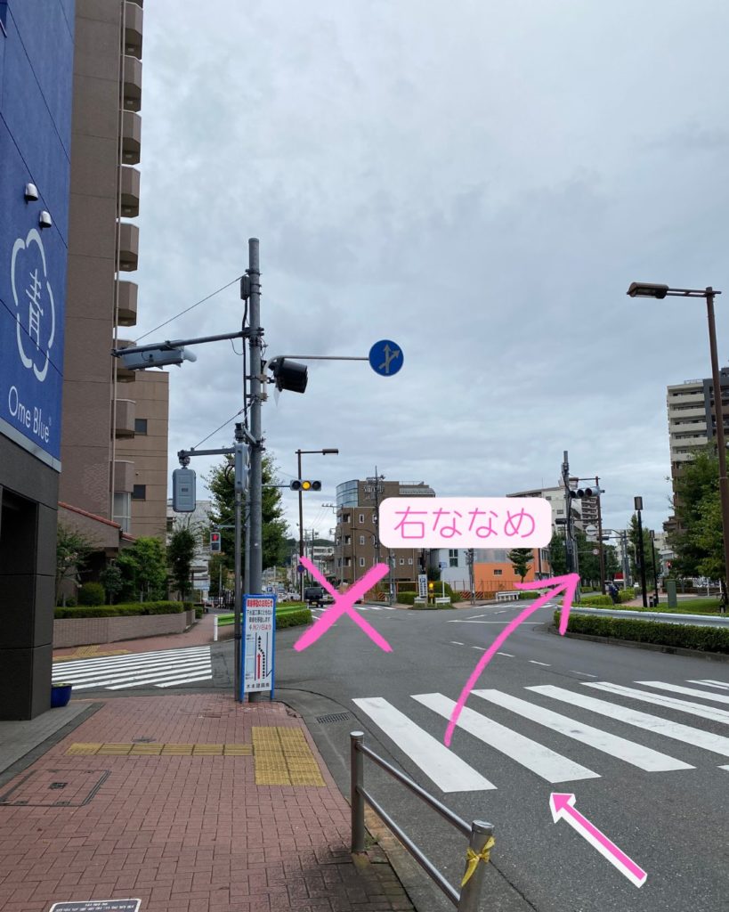 右ななめに進むとすぐに信号があります