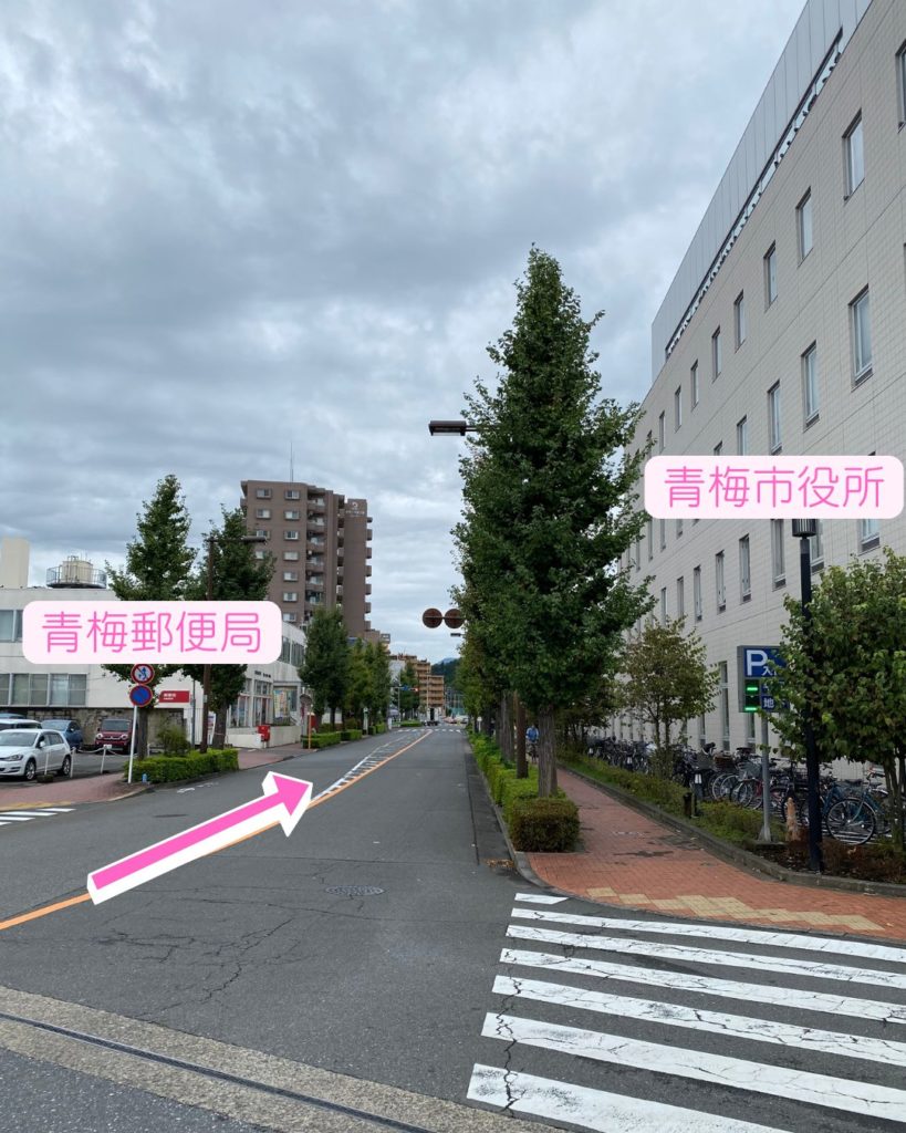 右手に青梅市役所、左手に青梅郵便局があります