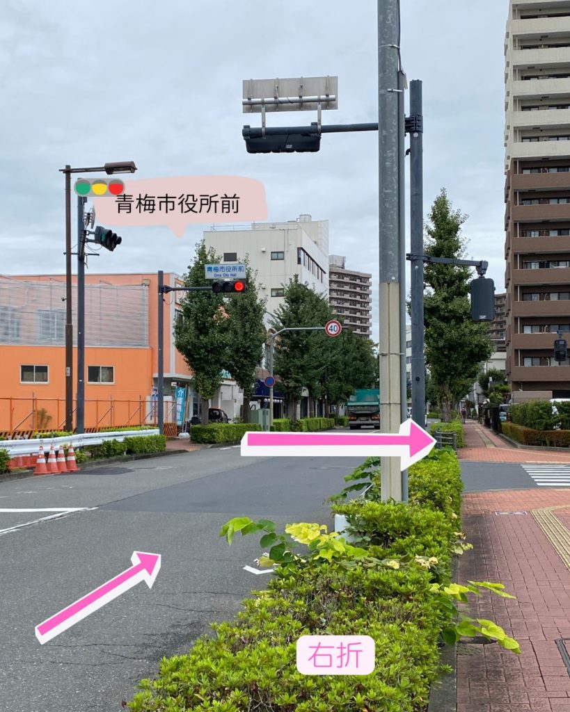 信号の標識は【青梅市役所前】です